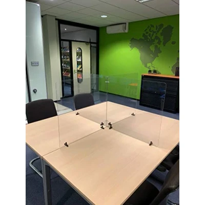 4 Transparent and Modular Office Divider Partitions with Office Vises: Effectively protects employees in their office environment where social distance is not always easy, so everyone can go to work safely and responsibly. Multiple combinations to fit the shapes and configurations of your desk or tables. Easy to assemble, the kits come with screens, feet and connectors. A small space under the screen allows the passage of documents Set I: 4 screens, 8 feet and 10 connectors (2x straight, 2x crossed, 2x T, 4x angle). Material: PC Screen dimensions: 690 W x 650 H mm.