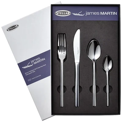 6 x Table Knife6 x Table Fork6 x Dessert Spoon6 x TeaspoonThe James Martin cutlery pattern is a beautifully simple design, exclusively designed by James Martin, exhibiting refined taste and style, and promising a long life for its perfectly polished finish.Manufactured from top quality 18/10 stainless steel, James Martin cutlery is endorsed with a lifetime guarantee.  Knives are not for sale to persons under the age of 18. - all knives and bladed products are delivered by Age Verified Delivery (AVD). The carrier may request proof of age in order to deliver your parcel. If proof of age is not available, or the recipient is underage, the carrier will refuse to deliver.