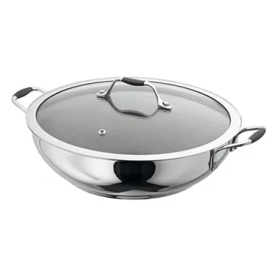 This James Martin 32cm Non-Stick Wok has cast stainless steel handles with an anti-slip silicone grip for added safety and comfort.The thick 'hot forged' base of this wok provides even heat distribution and is suitable for all hob types including induction. It is also oven safe up to 180°C.Included with this wok is a vented glass lid which allows you to check on your cooking without removing the lid.Weight: 2,381g, Height: 15.5cm, Width: 34.5cm, Length: 42.2cmThe non-stick cooking surface features a scratch resistant Teflon® Platinum Plus PFOA free which has a 10 year guarantee.James Martin cookware is suitable for dishwasher cleaning and is provided with a Stellar lifetime guarantee.