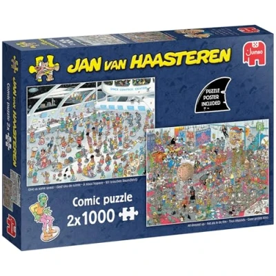DOUBLE THE FUN: With 2-in-1 puzzle, travel to the future and dive into Comicon, where cosplay, comics, gaming, movies, and sci-fi adventures await. Use the clues to explore both worlds! JAN VAN HAASTEREN: For jigsaw puzzle fans from all over the world, puzzles from Jan have always guaranteed hours of puzzling fun and are known for their vibrant colours and intricate details. MADE FOR ADULTS: These puzzles are designed for adults, for ages 14 and above. Enjoy the challenge of completing this puzzle scene accomodating to all levels, from beginners to pro puzzlers. 1000 PIECE PUZZLES: These 2 large 1000 piece jigsaw puzzles picture comical scenes which are a delight for all puzzling aficionados. The 1000pc puzzles are a perfect addition to your collection. PLANET IN MIND: This adult puzzle is both hardwearing and durable. Made from 100% recycled cardboard, you can rest assured your puzzling experience is not only fun, but also planet friendly., Manufacturer: Jumbo Group