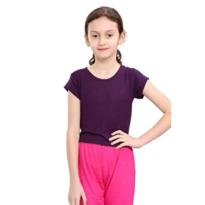 janisramone® Girls Kids Plain Short Sleeve Stretch Summer Tee T Shirt, Round Neck Basic Playing Running Yoga Active Wear Children Crop Top 3 13 Years Purple
