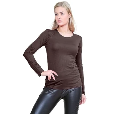 janisramone® Long Sleeve T Shirts Women, Plain Round Neck Breathable Basic Summer Tops for Women UK, Stretchy Slim Fitted Going Out Brown