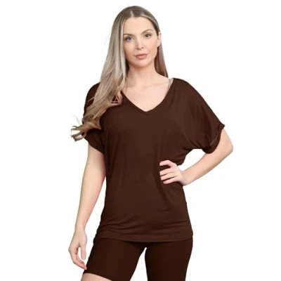 janisramone® V Neck Tops for Women UK, Women's Summer Tops, Baggy Fit Oversized T Shirts Womens, Batwing Turn Up Sleeve Casual Shirt Sizes 6 26 Chocolate Brown