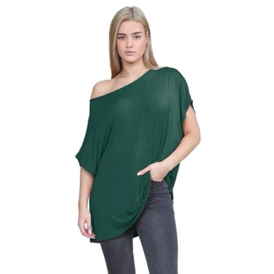 janisramone® Women's Off The Shoulder Batwing Top, Bardot Baggy Style Oversized T Shirt for Women New Plain Fashionable Ladies Tops Casual & Party Wear Bottle Green