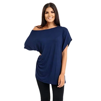 janisramone® Women's Off The Shoulder Batwing Top, Bardot Baggy Style Oversized T Shirt for Women New Plain Fashionable Ladies Tops Casual & Party Wear Navy