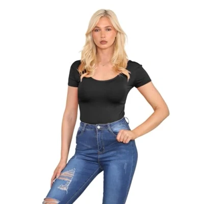 janisramone Womens Ladies New Cap Short Sleeve Plain Round Neck Stretch Leotard Bodysuit T Shirt Plunge Top Black