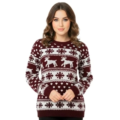 janisramone Womens Ladies New Unisex Christmas Reindeer Snowflake Novelty Knitted Xmas Jumper Sweater Top, 20 22, Wine