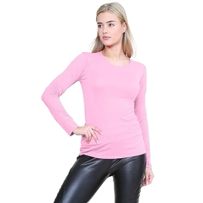 janisramone Womens Ladies Round Neck Long Sleeve T Shirt Stretchy Plain Fitted Basic Jersey Casual Tee Top Baby Pink