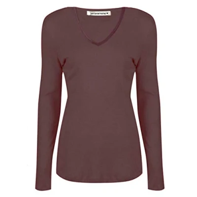 janisramone Womens Ladies V Neck Long Sleeve T Shirt Stretchy Plain Jersey Slim Fit Casual Basic Tee Tops Brown