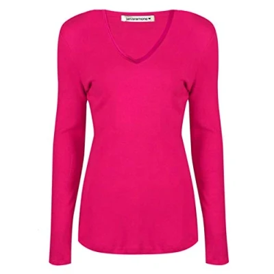 janisramone Womens Ladies V Neck Long Sleeve T Shirt Stretchy Plain Jersey Slim Fit Casual Basic Tee Tops Cerise