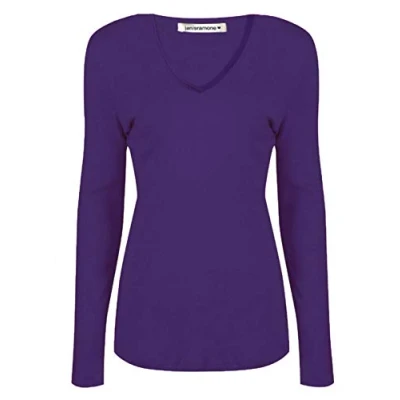 janisramone Womens Ladies V Neck Long Sleeve T Shirt Stretchy Plain Jersey Slim Fit Casual Basic Tee Tops Purple