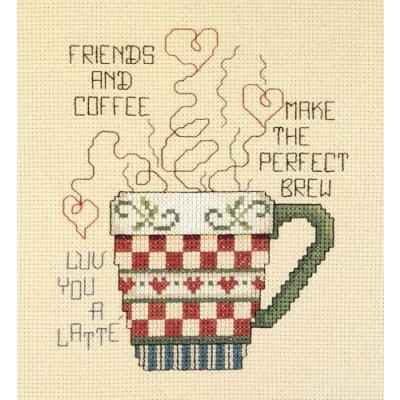 Friends and Coffee cross stitch is designed is by Stoney Creek 14-count cotton Aida 6- strand carded cotton floss Includes needle and graph Includes instructions