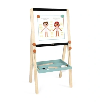 HOME SCHOOLING MADE FUN: This adjustable wooden board has two sides (chalk and magnetic) for variety and to support children's learning from age 3 upwards. A COMPLETE AND EVOLVING SET: Comes with 12 laminated posters, 3 pieces of chalk, 1 erasable marker, 1 ruler, 1 set square, 2 magnets and an accessory pot. The board grows with your child thanks to its adjustable legs. LEARNING THROUGH PLAY: Designed to develop fine motor skills, concentration and imagination. The educational posters allow children to explore the human body, space, the seasons and much more. FEATURES: FSC wooden board, double-sided (black slate + white magnetic), height adjustable (91 to 126 cm), foldable, comes with 23 accessories. From 3 years old. THE POWER OF PLAY: With bold and innovative collections, Janod accompanies children on the most beautiful of adventures: growing up! Beautiful toys for learning without even noticing, exploring the world, dreaming and sharing... Well played!, Manufacturer: JURATOYS