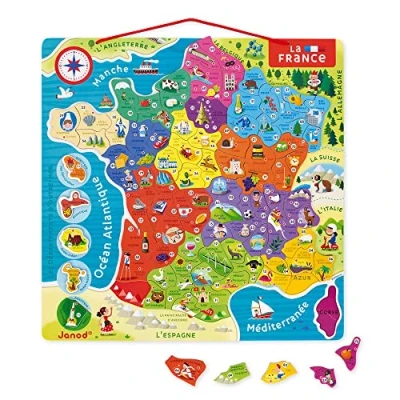 THE TOUR DE FRANCE IN 93 MAGNETS: With this map of France magnetic puzzle, your children will be able to discover and travel the entire country without leaving home! They will have fun putting the regions back in the right place to complete the map. LEARNING WHILE HAVING FUN: With this wooden puzzle, your children will be able to discover the regions of the country as well as some of their specialties. On each of the 93 magnets appear the number and name of the department, the capital and an illustration of a local specialty. What better way to memorize the cities and regions of our beautiful country and become an expert in geography? PUZZLE MAP OF FRANCE: This puzzle complies with the 2016 reform and includes 13 new regions. In addition to the regions, the magnetic board also indicates the major rivers, mountains, seas, oceans, overseas departments and border countries. GAME CONTENT: The puzzle is made of MDF wood and plywood. This map of France puzzle contains 93 magnetic pieces and a cotton string allows you to easily hang it on a wall. Dimensions: 36 x 1 x 36 cm. Ideal for children from 7 to 12 years old. FRENCH DESIGN: Janod toys are designed in France, in the Jura. We focus on the materials we use, the style and the colours. Original, educational and thoughtful toys and games to support your children in their development and their cognitive, psychomotor and socio-emotional development., Manufacturer: Janod