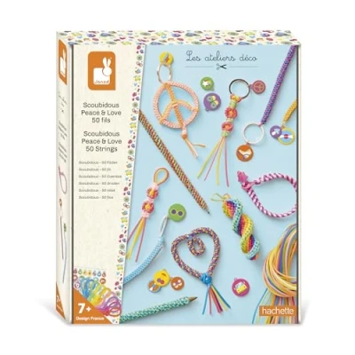 PEACE & LOVE SCOUBIDOUS KIT: This kit lets you make classic or original scoubidous with a Peace & Love theme. Children aged 7 and over will learn to create beautiful objects while developing their creativity and patience. HOURS OF FUN ON YOUR OWN: With 50 strands of scoubidous, 3 key rings, star beads and stickers, your children will have everything they need to have fun for around 4 hours, alone or with friends. An ideal activity even when you're away! A PERFECT AND INTEMPORARY GIFT: This kit is an excellent choice as a gift or to keep for yourself. Not only is it fun to play with, but it can also be used to create personalised objects to display or give as gifts, while stimulating children's manual and creative skills. FEATURES: Contains 1 notebook with 24 pages, 3 sticker sheets, 3 sticky note pads, 1 roll of adhesive tape, 1 eraser, 1 pencil, 1 multi-coloured pen (pink, blue, purple). Materials used : Paper, Adhesive, Cardboard, Plastic, Wood. LES ATELIERS DÉCO: This creative kit is part of a collection developed in collaboration with Hachette Editions, experts in creative leisure activities for children, offering activities and themes to meet the needs and expectations of every age., Manufacturer: JURATOYS