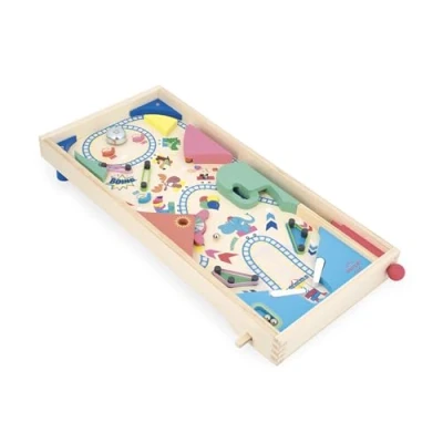 WOODEN FLIPPER: Ready to defy gravity? This brightly-coloured wooden pinball machine, supplied with 3 metal balls, is perfect for children aged 5 and over! Aim, shoot, score and have hours of fun! THE EDUCATIONAL ADVENTURE BEGINS HERE: throw the ball, ring the bell and collect the points! This wooden pinball machine for children aged 5 and over develops hand-eye coordination and helps you work out sums while having fun. FEATURES: Includes 1 pinball machine, 3 balls, 1 set of assembly instructions. Materials used : Wood (Plywood - Schima), Metal. Do-it-yourself product, instructions supplied in the box. Dimensions : L 55 x W 29.8 cm. From 5 years FULL OF FUN WITH APPLEPOP: Laughter and a good atmosphere guaranteed with the fun and offbeat games in the Applepop range from Janod, inspired by the happy and colourful world of the funfair to encourage children to grow up having fun all day long. THE POWER OF PLAY: With bold, innovative collections, Janod accompanies children on the most beautiful of adventures: growing up! Beautiful toys for learning without even realising it, exploring the world, dreaming and sharing... Well done!, Manufacturer: JURATOYS
