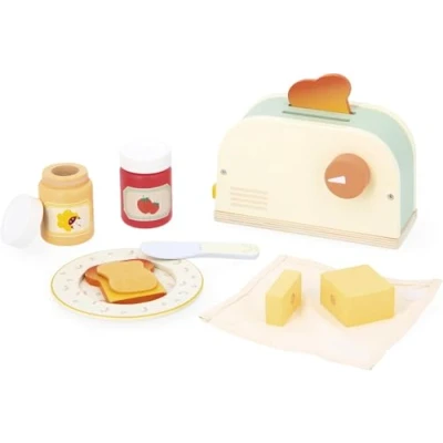 Janod Wooden Toaster for Children Imitation Breakfast Game 10 Accessories Included With Jumping Toast Develops Imagination From 3 years J06636