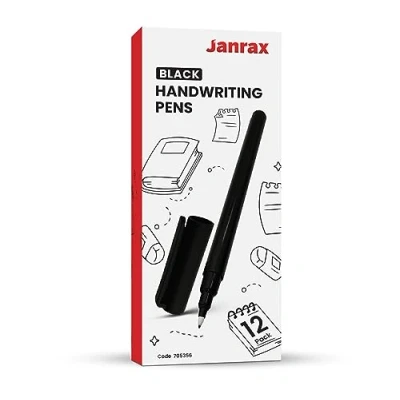 Pack of 12 Black Handwriting Pens by Janrax. Great for children in school to learn how to write and improve their handwriting. Perfect for all your note-taking, journaling, and creative endeavours. Designed to enhance your writing experience with their smooth and consistent ink flow with no smudging. The ink glides smoothly across the page, ensuring that your words flow seamlessly without any skips or smudges. Also available in blue from the Janrax range.