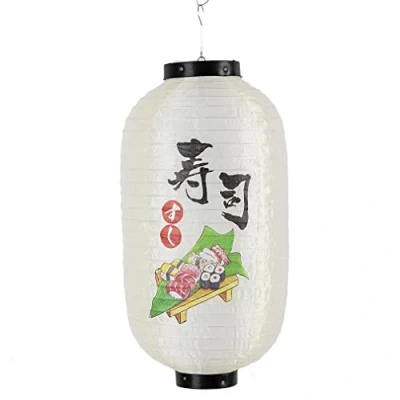 Asian lantern material: plastic coating. Asian lantern size: 22 cm in diameter, about 45 cm in height when opened. Asian lantern colours: multi-coloured. Japanese decoration - suitable for outdoor use Decorative Japanese design lantern, featuring cute black and red kanjis and sushi and other sashimi patterns on an Asian tray. An essential and very original decorative object that will seduce all lovers of Asian culture and atmosphere.