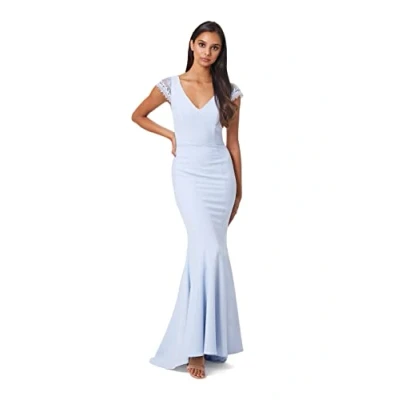 Jarlo London Women's Maia V Neck Maxi Dress with Lace Cap Sleeves and Button Open Back, Powder Blue, 18