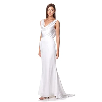 Mid-weight, fluid, non-stretchy fabric Cowl neckline Draped back Extended train to reverse Side zip fastening