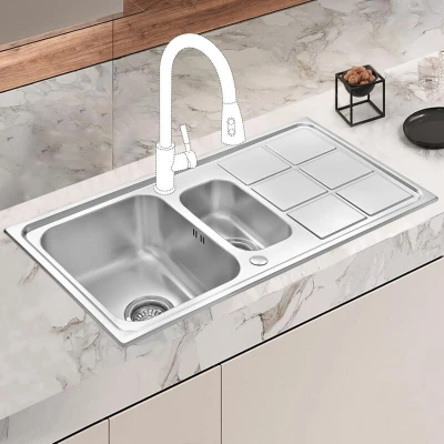General description This JASSFERRY Brilliant Stainless Steel Kitchen Sink features a 1.5 square bowl design with a Rome-style rectangle drainer and strainer waste. With dimensions of 970 x 500 mm, this sink combines functionality and elegance, making it a perfect addition to any kitchen. Technical specifications Dimensions: 970 x 500 mm Material: SUS304 stainless steel Finish: Satin Number of tap holes: 2 Includes: 1 cover Installation Reversible installation: Drainboard can be positioned on the left or right side. Usage Large drainboard for drying dishes or as an extra workspace for cutting vegetables and fruits. Single deep bowl design to accommodate large pots and stacks of dishes while preventing splashing. Easy to clean with a soft cloth or 3M sponge scouring pad. Other information