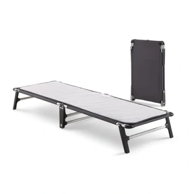 EASY TO CARRY - Just 7.1 kg, the LE59 folding camp bed is super lightweight and easy to transport. The perfect portable travel and camping bed to take anywhere. SUPER SLIM - Fold away bed only 8cm when folded, for easy storage for under sofa, under the bed, in a cupboard or car boot. No assembly required, and takes just seconds to set up, great for unexpected guests, kids sleepovers, spare room or office. STRONG 160kg WEIGHT CAPACITY - Single folding bed for adults and kids, the robust legs provide 6-point contact for a strong and stable sleep foundation, J-Grip Anti-Tip Legs securely click into position for enhanced stability. SUPPORTIVE MONO-TEX PLATFORM BASE – Stretch-resistant fabric ensures long-term durability and firm, even support. The added e-Fibre insulator pad adds warmth and comfort beyond a foam camping mat, while the sturdy fold up bed frame delivers greater stability and sleep comfort than an airbed. LE59 FOLDING BED DIMENSIONS - Folded: L8 x W70 x H95cm // Open: L190 x W70 x H23cm
