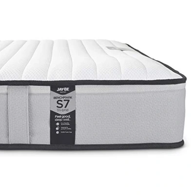 Tribrid Small Double: The Jay-Be Benchmark S7 Small Double Mattress offers a medium firmness, combining a deep e-Spring core with micro e-Pocket springs, Memory e-Fibre and extra-fine Advanced e-Fibre to deliver pressure-relieving, adaptive support. Breathable Layers: A deep e-Spring core is also topped with a cushioning layer of breathable e-Fibre comfort layers for improved moisture and temperature regulation for a fresh, ambient sleep environment all night long. Hypoallergenic: Soft to touch luxury and durable knitted cover made with hypoallergenic, odourless materials that create a less hospitable environment for dust mites and other microorganisms. Sustainable Materials: Made in the UK using certified zero-to-landfill manufacturing, all Jay-Be Benchmark mattresses feature Advanced e-Fibre and materials that are 100% foam-free and 100% recyclable. Easy Delivery and Set-Up: Vacuum-packed, rolled, and sealed at production to keep your mattress fresh and reduce packed size by up to 70%. Delivered compressed for easy handling. Simply unbox, unroll, and allow it to expand.