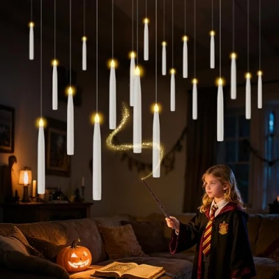 【Floating Candles for Holiday Decoration】Our flameless candles set packed in a beautiful gift box - 20pcs 6.7 inch taper candles,1 magic wand remote and 11pcs hooks,these realistic, warm LED taper candles are ideal for Halloween, Christmas, birthday, themed parties, churches, and indoor and outdoor home decorations to create amazing ceiling decor 【Magic Wand Remote Control】Equipped with a magical and fun wand remote control (13 inches) that can magically turn on and off these flickering flameless hanging candles simultaneously. This fun operation lets you feel like a wizard, creating an immersive magical experience.Note: each taper candle/remote requires 1 AAA battery (batteries not included) 【Amazing Magical Floating Effect】All flameless candles comes with a 4.9 foot fishing line (almost invisible) that is pre connected to these LED cone shaped candles that are ready to be hung.Or just place some of the candles on a shelf or table.The 3D warm light flickers is realistically mimic the gentle sway of a true candle flame, create a romantic ambiance 【Safe and Long-lasting Use】 Battery-operated floating candles are flameless and safe for families with children and pets without worrying about fire hazards and the mess of melted wax. LED flameless candles are energy-efficient and provide long-lasting illumination up to 200 hours, reducing the need for frequent battery replacements 【Holiday Decorations & Magical Gifts】 LED floating candles are the perfect for a variety of indoor decorations, The hangging candles with a magic wand remote will bring a feel of the magical world! Also,it is an ideal gift for friends and family.If you have any question with our flameless candles,please feel free contact us