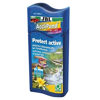 Pond environment ideally suited to the requirements of the fish: water conditioner to activate the resistance and to promote the fish’s health Simple to use: calculate the required quantity, mix it in a watering can with pond water, distribute evenly over pond Promotes readiness to spawn, activation of resistance to disease thanks to valuable plant extracts and vitamins, promotion of vitality, normal energy metabolism due to iodine, folic acid to help the immune system function normally Stress-free fish transport, acclimatisation of pond fish, after the use of remedies Contents: water conditioner, AccliPond. Dosage 40 ml per 800 l pond water