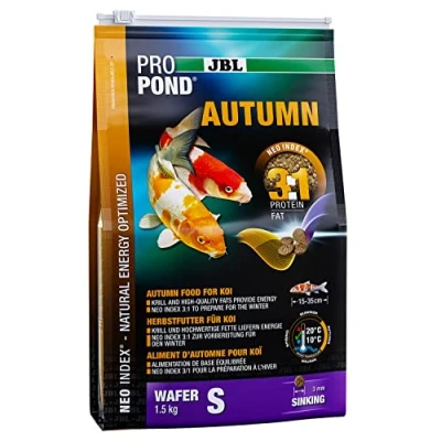 Autumn food for Koi from 15-35 cm in size at a water temperature of 10-25 degrees: sinking food wafers Adapted to the special nutritional needs in autumn: 3:1 protein-fat ratio according to NEO index (taking water temperature, function, animal size and age into consideration), Preparation for winter Healthy growth thanks to high-quality proteins, High energy storage through omega 3 and omega 6 fatty acids, Support of colouring thanks to carotenes, Optimal digestion and improved absorption of minerals and trace elements due to raw ash content Feeding recommendation: Once or twice per day, As much as is eaten in a few minutes Contents: 1x JBL 1.5 kg, ProPond Autumn, Autumn food for Koi, Sinking food wafers, 4123700, Size: S, Resealable air- and waterproof bag
