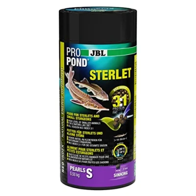 Right protein/fat ratio 6:1 in accord. with NEO index which takes temperature, function, animal size, age into account With salmon, shrimp, octopus, spirulina and gammarus for a natural diet for sterlets (at 10-25 °C) Food size S (3 mm) for fish from 10-30 cm Sinking pearls with 40 % protein, 12 % fat, 2 % crude fibre and 8 % crude ash Small food pearls in resealable bag (air, water and lightproof) for the preservation of quality