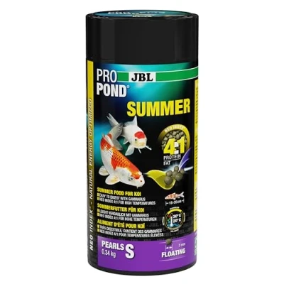 Right protein/fat ratio 4:1 in accord. with NEO index which takes temperature, function, animal size, age into account With corn, salmon, soya, shrimp, gammarus and spirulina for vigorous and healthy koi (at 20-30 °C water temperature) Feed size S (3 mm) for fish from 15-35 cm. Without artificial colouring = clear & clean water Floating food pearls with 28 % protein, 7 % fat, 3 % crude fibre and 8 % crude ash Food pearls in resealable bag (air, water and lightproof) for the preservation of quality