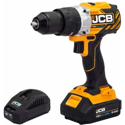 JCB 18v Brushless Cordless Combi Drill, 2.0ah Lithium ion Battery & Fast Charger, Variable Speed LED Light, Rubber Grip Overmould with 3 Year Warranty