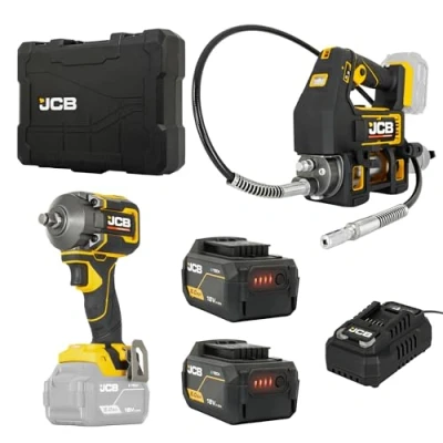Heavy-Duty Maintenance Kit: Professional 18V power tool set including a 620Nm high-torque 1/2" impact wrench and cordless grease gun, designed for workshops, plant machinery maintenance and agricultural servicing. High Torque 1/2" Impact Wrench (620Nm): Ideal for wheel nuts, bolted joints, mechanical fixings and construction assemblies. Delivers strong fastening and breakaway force for demanding applications. Cordless Grease Gun for Service & Lubrication: Variable speed control provides precise grease flow for bearings, pivots and moving components. Flexible hose improves access to tight lubrication points and LED Light for visibility Long Runtime with 2× 5.0Ah Batteries: Supplied with high-capacity 5.0Ah lithium-ion batteries for extended working time, plus a 4.5A fast charger to minimise downtime on site. Portable Soft Tool Bag Storage: Durable carry bag providing organised transport and integration with existing jobsite storage setups., Weight: 23.14853751 pounds, Manufacturer: JCB