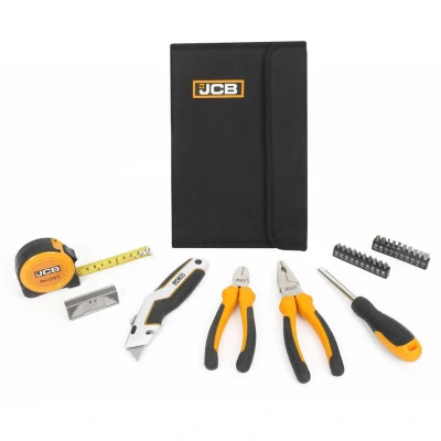 General description JCB 26 Piece Tool Set in pouch is ideal for around the home and workplace for general maintenance tasks. Technical specifications Contents: 180mm combination pliers 150mm diagonal cutters 5m tape measure Retractable knife 5pc knife blades 20pcs 25mm screwdriver bits Magnetic bit holder Durable tool storage pouch Other information Combination pliers feature a high leverage design and corrosion resistant coating. Retractable knife is constructed from high quality Aluminium alloy with SK5 steel blades. Tool storage pouch is made from Polyester with hook and loop fastening.