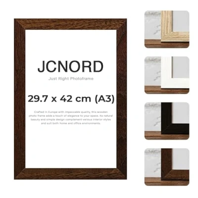 🇪🇺 𝗘𝘂𝗿𝗼𝗽𝗲𝗮𝗻 𝗖𝗿𝗮𝗳𝘁𝘀𝗺𝗮𝗻𝘀𝗵𝗶𝗽: Our frames are skillfully handcrafted in Europe by master artisans with great attention to detail. Quality control standards at JCNORD ensure that each frame not only brings your memories to life, but also adds finesse to your interior design 💎 𝗣𝗿𝗲𝗺𝗶𝘂𝗺 𝗠𝗗𝗙 𝗣𝗶𝗰𝘁𝘂𝗿𝗲 𝗙𝗿𝗮𝗺𝗲: Expertly crafted from high-quality, thick MDF wood with a depth of 18 mm and a width of 15 mm, ensuring exceptional durability and long-lasting quality. Our frames are made of Shatterproof Acrylic Glass to protect your precious memories. The reinforced back panel is fitted with additional clips to prevent the picture from slipping and provide extra protection 📐 𝗣𝗿𝗲𝗰𝗶𝘀𝗲 𝗗𝗶𝗺𝗲𝗻𝘀𝗶𝗼𝗻𝘀: Our frame measures 29.7 x 42 cm (A3), with external dimensions of 32.6 x 44.9 cm, a profile width of 18 mm, a profile depth of 15 mm and a weight of 0.65 kg 🖼️ 𝗖𝘂𝘀𝘁𝗼𝗺𝗶𝘇𝗮𝗯𝗹𝗲 𝗛𝗮𝗻𝗴𝗶𝗻𝗴 𝗢𝗽𝘁𝗶𝗼𝗻𝘀: With clips for vertical or horizontal placement, our frame offers versatility for any space and enhances your interior design with its timeless beauty 🎨 𝗘𝗹𝗲𝗴𝗮𝗻𝘁 𝗪𝗮𝗹𝗻𝘂𝘁 𝗙𝗶𝗻𝗶𝘀𝗵: Our frames feature a stunning walnut color that blends seamlessly into any interior and adds an elegant accent. The durable paint and varnish provide a striking color brilliance while allowing for easy cleaning to maintain its beauty for a long period of time