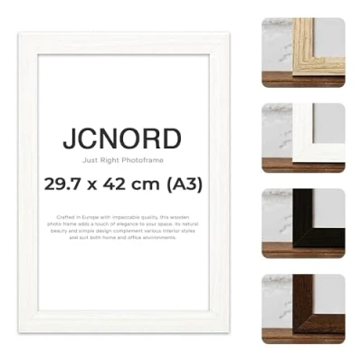 🇪🇺 𝗘𝘂𝗿𝗼𝗽𝗲𝗮𝗻 𝗖𝗿𝗮𝗳𝘁𝘀𝗺𝗮𝗻𝘀𝗵𝗶𝗽: Our frames are skillfully handcrafted in Europe by master artisans with great attention to detail. Quality control standards at JCNORD ensure that each frame not only brings your memories to life, but also adds finesse to your interior design 💎 𝗣𝗿𝗲𝗺𝗶𝘂𝗺 𝗠𝗗𝗙 𝗣𝗶𝗰𝘁𝘂𝗿𝗲 𝗙𝗿𝗮𝗺𝗲: Expertly crafted from high-quality, thick MDF wood with a depth of 18 mm and a width of 15 mm, ensuring exceptional durability and long-lasting quality. Our frames are made of Shatterproof Acrylic Glass to protect your precious memories. The reinforced back panel is fitted with additional clips to prevent the picture from slipping and provide extra protection 📐 𝗣𝗿𝗲𝗰𝗶𝘀𝗲 𝗗𝗶𝗺𝗲𝗻𝘀𝗶𝗼𝗻𝘀: Our frame measures 29.7 x 42 cm (A3), with external dimensions of 32.6 x 44.9 cm, a profile width of 18 mm, a profile depth of 15 mm and a weight of 0.65 kg 🖼️ 𝗖𝘂𝘀𝘁𝗼𝗺𝗶𝘇𝗮𝗯𝗹𝗲 𝗛𝗮𝗻𝗴𝗶𝗻𝗴 𝗢𝗽𝘁𝗶𝗼𝗻𝘀: With clips for vertical or horizontal placement, our frame offers versatility for any space and enhances your interior design with its timeless beauty 🎨 𝗘𝗹𝗲𝗴𝗮𝗻𝘁 𝗪𝗵𝗶𝘁𝗲 𝗙𝗶𝗻𝗶𝘀𝗵: Our frames feature a stunning white color that blends seamlessly into any interior and adds an elegant accent. The durable paint and varnish provide a striking color brilliance while allowing for easy cleaning to maintain its beauty for a long period of time