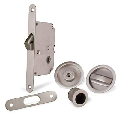 Material: Zamak Round sliding door lock set consisting of 2 surfaces, 1 pull and drop lock, 1 complete lock