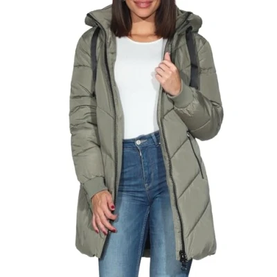 Quilted coat for women, hood with drawstring, stand-up collar, fully lined with 100% polyester lining, two-way zip, side pockets with zip, overcut shoulders Long sleeves, ribbed cuffs casual look