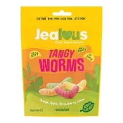 π¬ TANGY WORMS Yummy 100% VEGAN & NATURAL FRUIT Chewy Candies. Amazing, tasty mix flavours of juicy Apple π, Lemon π, Strawberry π and Orange π. Our jelly fat free gummies treats are made with finest REAL FRUIT JUICE. We are obsessed with giving you the best, which is why we make sweets absolutely without fakery or fluffy animals β so you can treat yourself better. Popular with both kids and adults: everyone can enjoy the sweetness of life. This is a 125 gram bag. π± π QUALITY and ALLERGENS: these delicious gummy sweets are 100% PLANT BASED, GLUTEN, and DAIRY FREE. They are VEGETARIAN approved and also 100% GELATINE FREE, NON-GMO and HALAL certified.βοΈFurthermore they are FREE FROM: to make our treats truly sweet, we've eliminated PALM OIL and contain NO ARTIFICIAL COLOURS, no additives, no preservatives and NO SYNTHETIC FLAVOURS. So YES, theyβre 100% NATURAL. Our sweets taste exactly like their fruit flavours because we use real fruit juices. π π SHAMELESSLY TASTY: Enjoy all the benefits without compromising on taste. Every tangy bite of Jealous Sweets is a burst of the best fruity and savoury flavours. All our low calorie sweets are bursting with flavour and have great texture. Have fun in a pick and mix sharing with friends or family (or not, we get it if you want to have them all by yourself). Make every celebration and treat moment sweeter: ideal for birthday parties, nights in, movie time with friends, or even on the go. ππ SUSTAINABLE & ETHICAL: With quality, plant-based, earth-safe ingredients, you can enjoy the sweetness of life, guilt-free. Our sweets are cruelty-free and have no animal derived ingredients, so you can enjoy them guilt-free. β»οΈ To help build a greener planet, we made 24g bags recyclable. Our goal is to have all packaging RECYCLABLE by the end of the year. For sweets to be really good, there should be no artificial flavours. All sweets are responsibly portioned to promote mindful eating. π€ π OUR STORY & OUR MISSION: The company was set up by two mates, Taz and Imran, to bring some fun back to the everyday. Our junk-free gums are simple shamelessly tasty sweets that are mindfully portioned and sustainable. Since day one, we prioritised innovation, quality, and flavour. βοΈ We always want to do better than those confectionery giants, regardless of our size. As long as we have grit, perseverance, passion, and love of what we are doing, we will continue our mission.