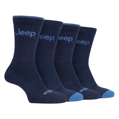 Jeep 4 Pairs Mens Anti Blister Thick Cushioned Luxury Boot Socks for Outdoor Activities Hiking Walking Trekking (6 11, Navy/Denim)