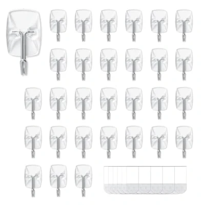 INCLUDES- 30 clear wall hooks and 40 adhesive strips; 1 hook holds around 225g DAMAGE-FREE ORGANIZATION- Say goodbye to holes, marks, or sticky residue on your walls, doors, cabinets, or closets; Our wall hangers without nails are easy to use and help keep your walls looking beautiful NO TOOLS REQUIRED- Hang clipboards, brushes, dog leashes, kitchen utensils, keys and accessories where you want without nails or a hammer STRONG AND VERSATILE- These hooks for hanging hold strongly on a variety of indoor surfaces including finished wood, glass, tile, metal, and other smooth surfaces. Do not recommend to use on painted walls REMOVES CLEANLY- Reorganize when inspiration strikes; These wall hooks leave no sticky adhesive behind; Perfect to use inside cabinets and closets, in your college dorm, apartment, home, and office, Weight: 0.31085178942 pounds, Manufacturer: JELLYSUB