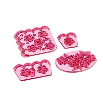 Set of 4 edge cutters perfect for adding extra detail to cutwork embroidery Dimensions: between 32 and 72 mm (1 ¼ and 3 in) Ideal for use with sugar paste, gum paste or flower modelling paste Made from high quality ABS Thermoplastic Handwashing recommended