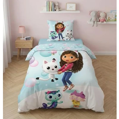 Jerry Fabrics Gabby et la Maison Magique Bedding Set, Reversible Duvet Cover 140 x 200 cm + Pillowcase 65 cm, with Pandy Paws, Baby Box, Navy and Fairy Minette