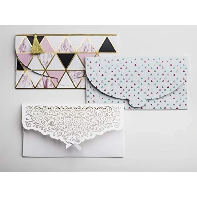 3 jewellery envelopes, each seoarat in foil With an insert for writing yourself inside Laser cut patterns and fringe