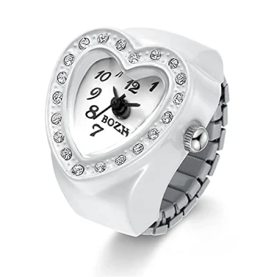 PRECISE TIME KEEPING -- Quartz movement and battery, provide accurate and constant time keeping. Simple dial with big numerals and distinct hands. Display time clearly. Easy-to-read. Tell time your way with this watch using clear dial and distinct hands. HIGH QUALITY -- Adopted with polished alloy case and band, the finger ring watch is durable and wear-resistant. Stainless steel back cover. Hard glass is scratch resistant. UNIQUE DESIGN -- A perfect combination of finger ring and watch, of practical use and decoration. Elastic strap, easy to put on or take off, and suitable for all size finger. Fashionable heart shape design. This funky finger watch is designed to stand the test of time. Fashion accessory for your daily dressing match. IDEAL GIFT -- Heart finger Ring watch is so cute and very smart looking. Suitable for men and women. This mini pocket watch pair with most costume and suitable for various occasions. Casual elastic finger watch is a great gift for Birthday, Valentine’s Day, Christmas, Anniversary, Fathers Day, Mothers Day, etc. PURCHASE WITHOUT WORRY: Package includes a finger watch, a gift bag and a backup battery. If the watch does not work when received, you can try to change a battery, as it is possible that the battery dead. We offer 60-day 100% MONEY BACK or FREE REPLACEMENT, Please feel free to contact us if you have any questions or problems.