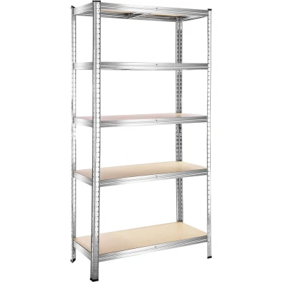 General description Heavy duty galvanised metal 5 Tier Racking Shelf is perfect for storage and organisation of stock in warehouses and shops. This racking unit is sturdy and durable, featuring five solid MDF shelves that are adjustable. It can also be split to create two different units, a bench, or a corner unit. This versatile shelving unit is ideal for warehouses, garages, stock rooms, and kitchens. It is easy to assemble with no screws or bolts required. Technical specifications Product Size: 90 x 40 x 180 cm (L x W x H) Load Capacity: 175 kg per shelf (evenly distributed) Post Thickness: 0.55 mm Compatibility and accessories Includes 1pc Racking Shelf English manual included Installation Quick and easy bolt-less assembly system Can be assembled in minutes Adjustable layout with options for full-height (180 cm) or half-height (90 cm) shelves Usage Ideal for use in garages, sheds, warehouses, workshops, garden centres, and offices Other information Each bay has a rust-resistant