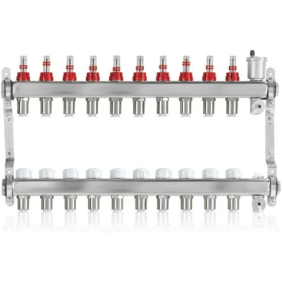 General description JG Underfloor 10 Port Manifold connects and centralizes underfloor (UFH) pipework in one place and distributes warm water through the pipe circuits to provide even and comfortable heat. When combined with the JG Aura wiring centre and JG Aura heating controls, it offers independent zone control. Made from high-performance stainless steel, the manifold is manufactured to the highest standards and is designed for underfloor heating applications only. Technical specifications Material: Stainless steel Number of ports: 10 Compatibility and accessories Suitable for use with JG Speedfit PEX and polybutylene barrier pipe (inserts required) Screw plugs, pipe inserts (STS), and collet clips supplied Installation Fast and simple to install with a pre-fitted wall bracket and vibration isolation mount Features push-fit connections (JG Speedfit) Protective dust caps are supplied on the return rail, removable when installing circuit actuator valves Usage Distributes warm water