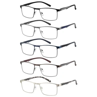 JM 5 Pack Rectangular Reading Glasses Men, Blue Light Blocking Computer Readers, Metal Thin Frame Spring Hinge Eyeglasses, 2.0+